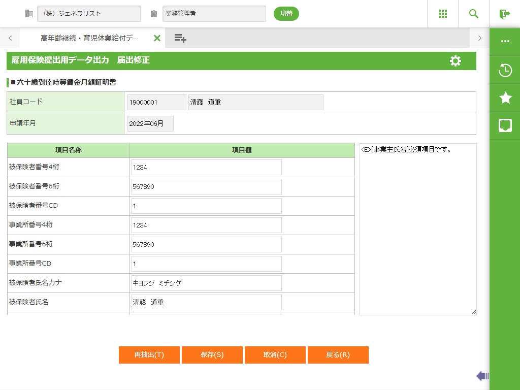 ・ 検索条件設定画面(第1画面)で「検索」ボタンをクリックすると、出力用の届出データを作成します。 以降は3.1.62 社員雇用保険情報登録、3.1.66 社員休業時短情報登録(または3.1.64 社員育休情報登録)より取得元のデータを変更しても届出データを自動で更新しません。 届出修正画面(第3画面)および賃金修正画面(第4画面)、賃金月額証明書 届出修正画面(第5画面)で届出データを直接修正できるようにしているため、自動で更新してしまうと、修正したデータが消えてしまうためです。 取得元データを変更した場合は、届出修正画面(第3画面)または賃金修正画面(第4画面)、賃金月額証明書 届出修正画面(第5画面)で「再抽出」を行い、取得元データの変更内容を届出データに反映してください。