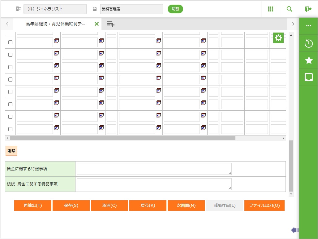 ・ 指定した申請年月、提出日時点の社員育休情報(テーブル)の内容でデータ作成します。出生後休業支援給付金の対象期間外の休業や、通算して14日未満の休業でもデータ作成しますので、内容を必ずご確認の上、申請してください。