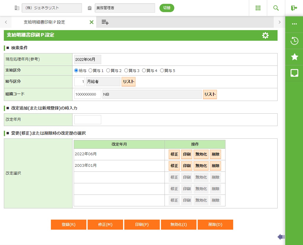 新規登録時は、西暦6桁または和暦5桁(元号は法人別システム管理マスタの設定に従います。)で入力します。修正時は、登録済みの改定年月から選択します。 |