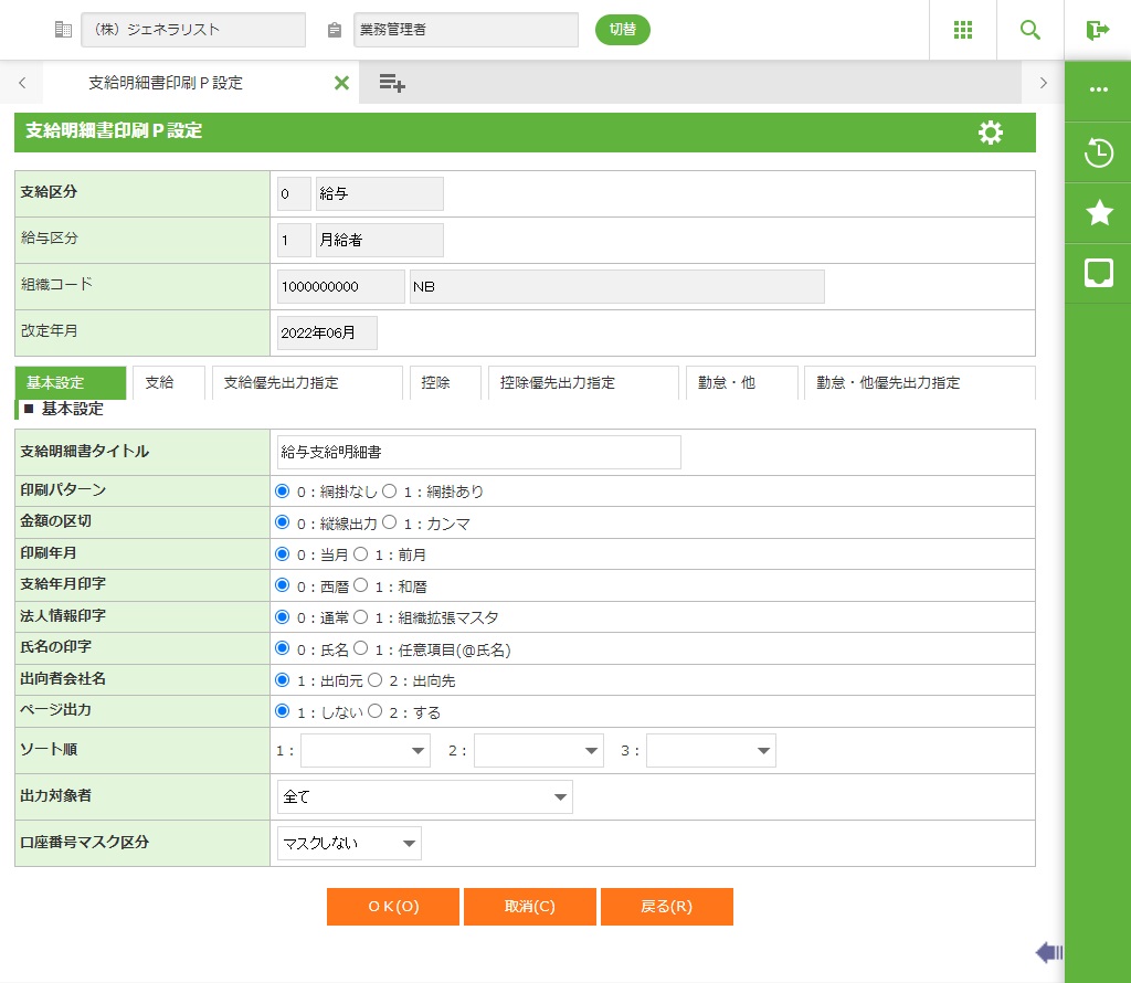 ・ 「法人情報印字」の設定により支給明細書、賞与明細書に出力する法人名称、法人郵便番号、法人住所を、通常(法人単位)、もしくは組織拡張マスタから選択することができます。