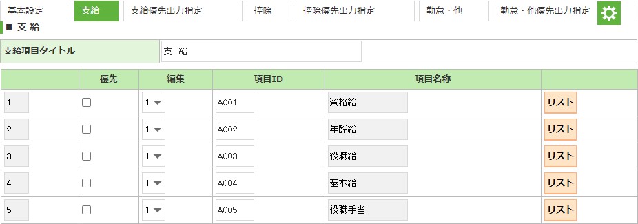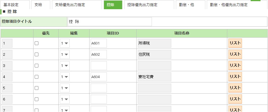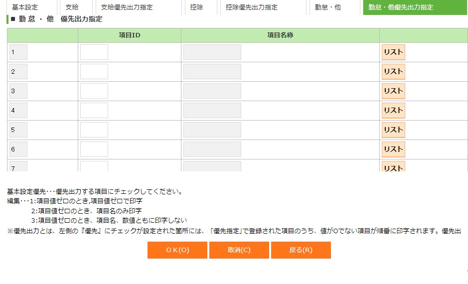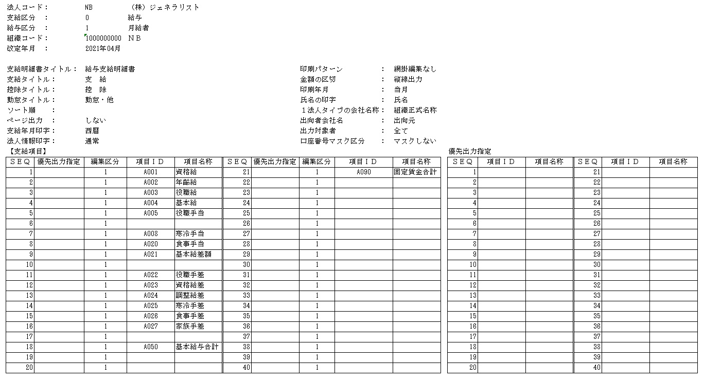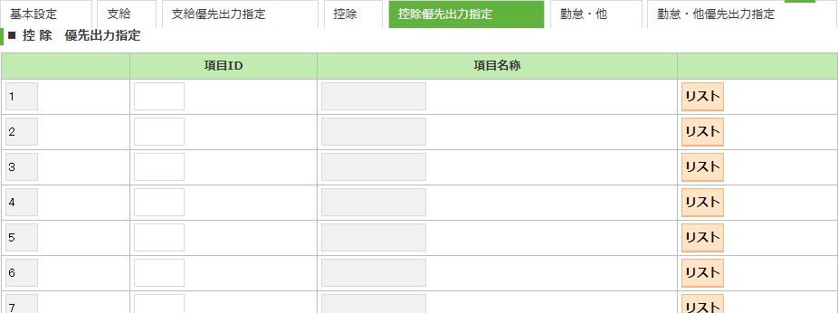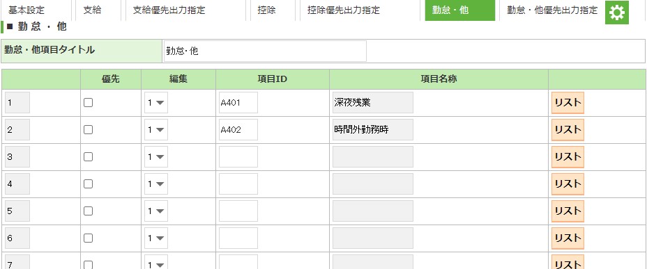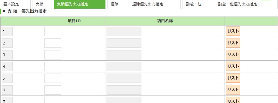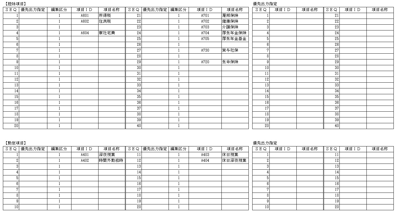 優先出力する項目については、チェックボックスにチェックをいれます。優先出力とは、項目に値がない場合に明細書にスペース行ができないように設定するものです。優先のチェックをつけた項目欄に優先出力指定で指定した項目IDを順に印字します。値が0の場合は次の優先順位の項目を印字し、明細書にスペース行ができないようにすることができます。優先のチェックをつけている箇所以上に印字する項目があった場合は、最後の優先出力項目名を「その他支給等」または「その他控除等」とし、数値は残りの項目の合算値を印字します。