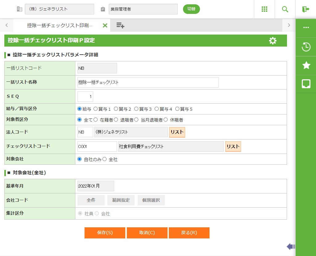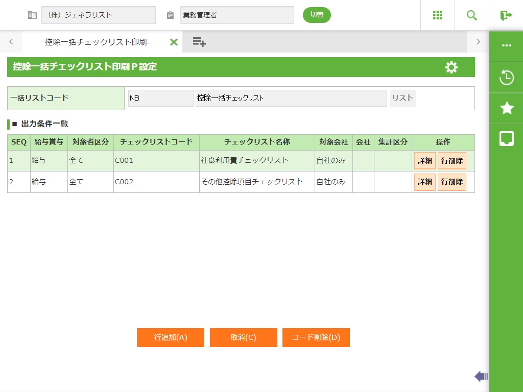控除一括チェックリスト出力処理の実行時に指定する一括リストコードの登録を行います。