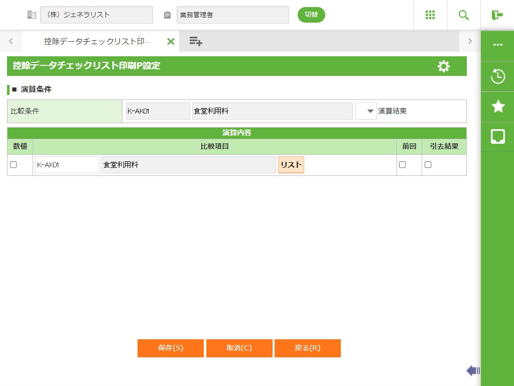 数値区分をチェックしている場合は、チェックリスト出力項目と比較する固定値を入力します。 数値区分をチェックしていない場合、チェックリスト出力項目と比較する控除項目定義マスタの控除項目コードを入力します。 <リスト>控除項目コード検索画面を呼び出します。 |