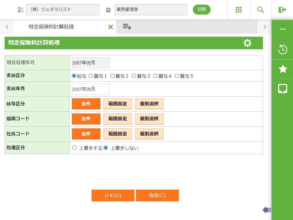 ・ 特定保険料計算処理では給与計算もしくは賞与計算にて一般保険料(個人分)が算出(控除)された社員が処理対象となります。休退職区分、給与最終支給年月および賞与最終支給年月は参照していません。