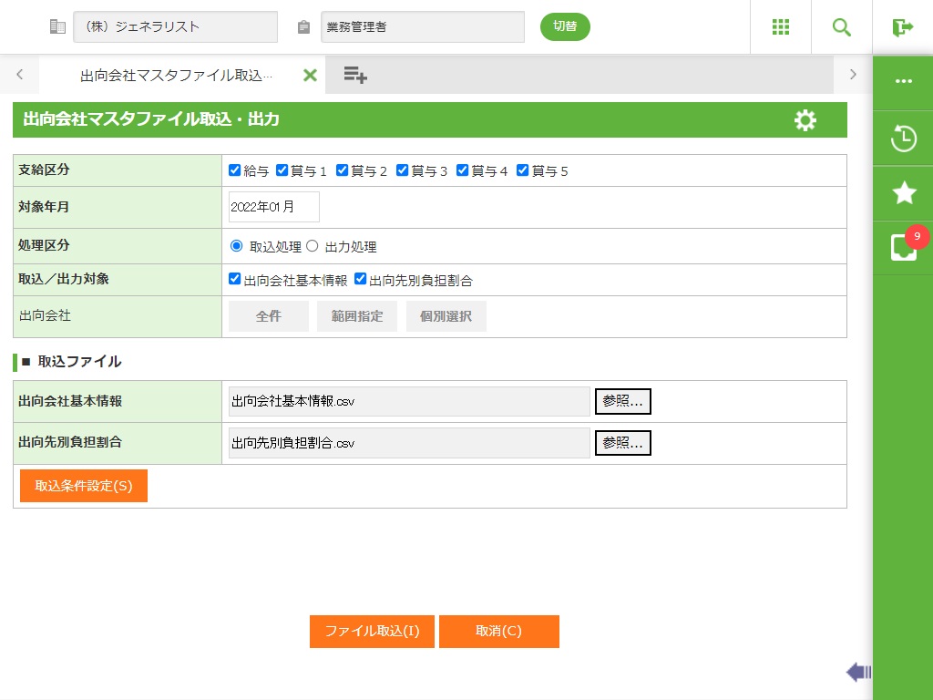 ・ 指定された処理年月で出向会社基本情報、出向先別負担割合のCSVファイルを取込みます。