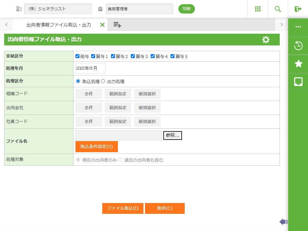 ・ 指定された処理年月で出向者別負担割合のCSVファイルを取込みます。