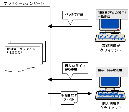 ・ 本機能で作成した明細書のPDFファイルは、個人ログインした利用者が給与/賞与明細書(1.3.4)から閲覧することができます。以下の図に、本機能の概要を示します。PDFファイルは、アプリケーションサーバ上に作成またはデータベースのテーブルに保存することができます。詳細はインストール手順書の「付録C 帳票Web配信の設定について」を参照してください。