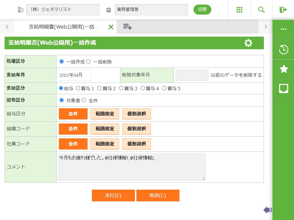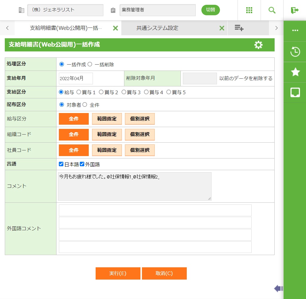 外国語で支給明細書を出力する場合「1」を設定します。支給明細書(Web公開用)一括作成画面に言語の選択区分と外国語コメント欄を表示します。 |