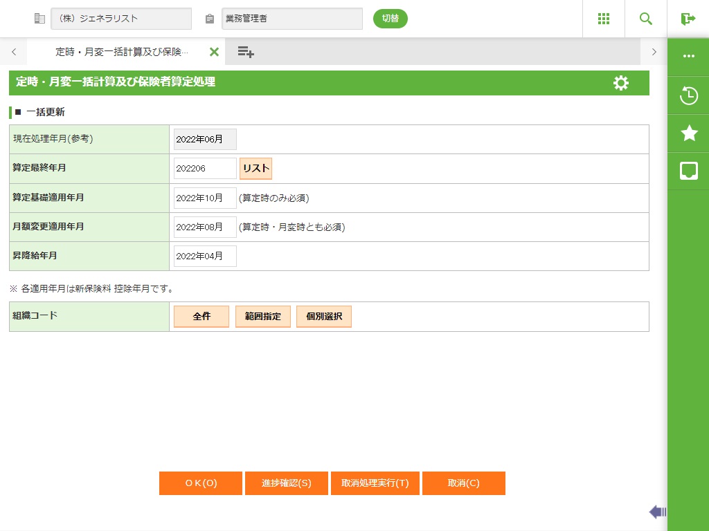 月額変更の対象者がいる場合、または算定基礎処理月に、それぞれの最終給与年月および新保険料の適用年月を指定して処理を実行します。