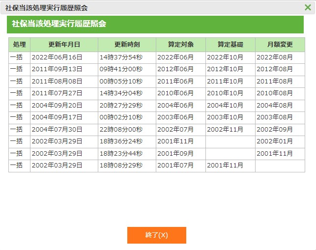 社会保険料算定の対象になる最終月を西暦6桁または和暦5桁(元号は和暦省略入力記号(アルファベット1文字))で入力します。算定もしくは月変の対象となる3ヶ月の最後の月を入力します。 <リスト>3.5.3.8 社保当該処理実行履歴表示参照画面を呼び出します。 |