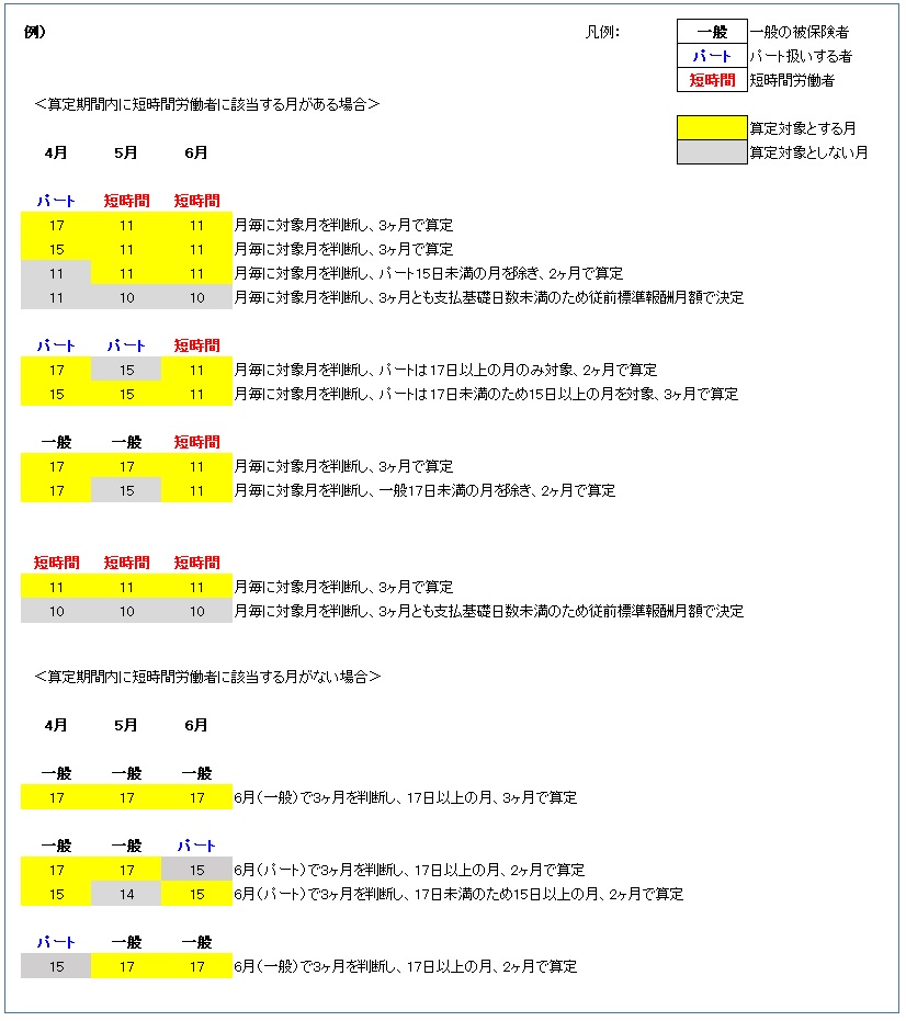 一般の被保険者は17日以上、パート扱いする者は17日以上(算定時、すべて17日未満の場合は15日以上の月)で判断します。