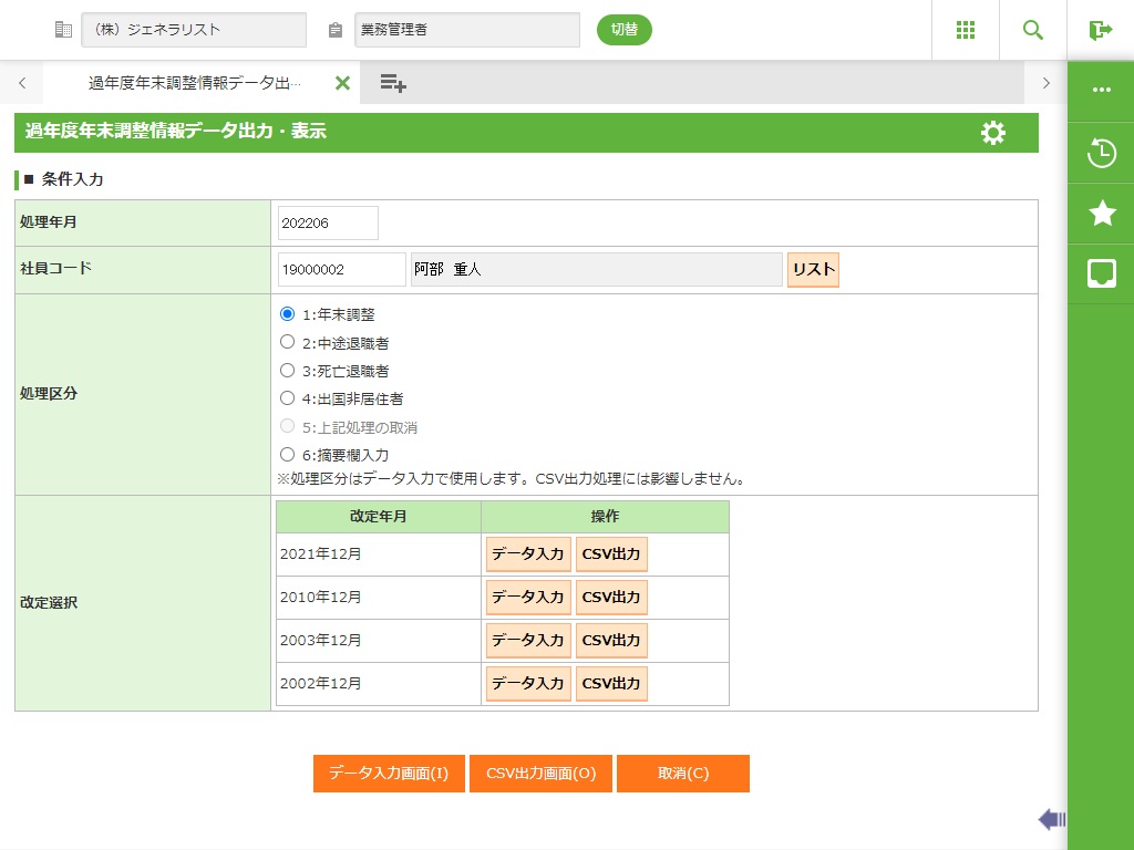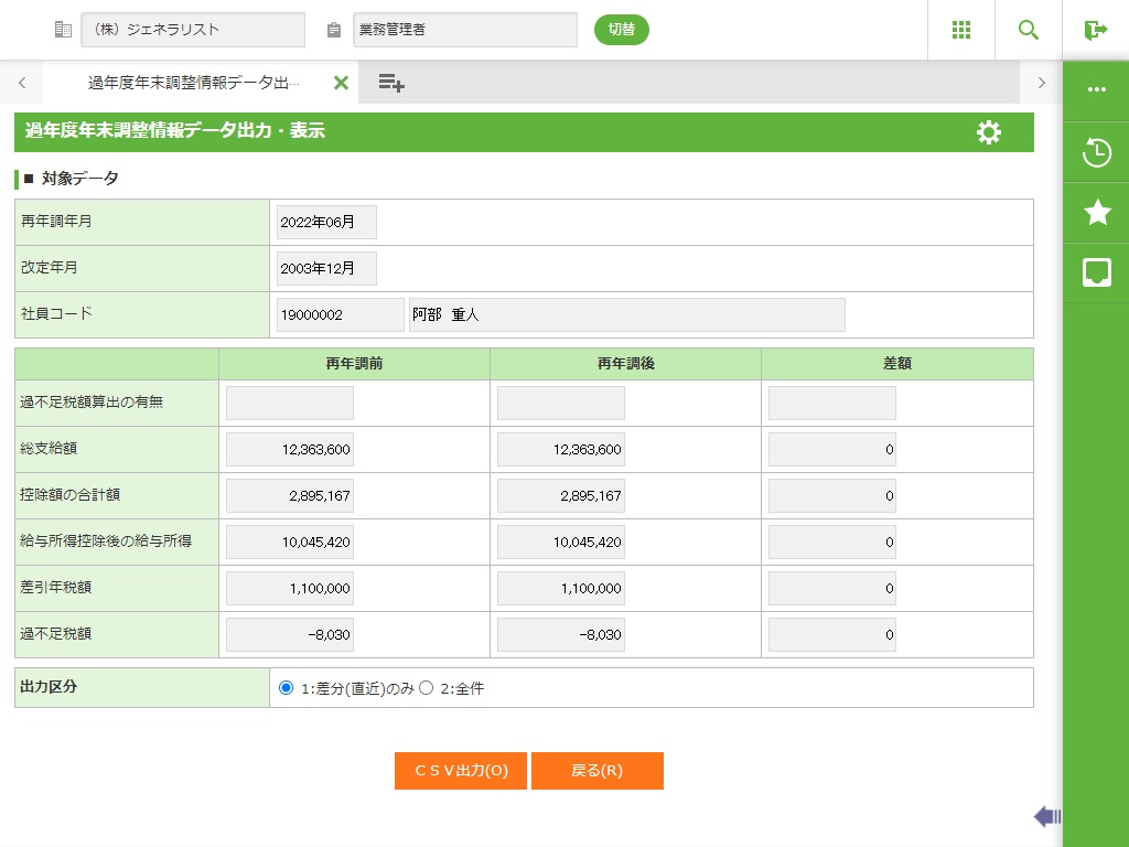 過年度の年末調整において、扶養情報や金額に誤りがあった場合、年末調整計算を再実行し、その結果を表示、CSV出力します。