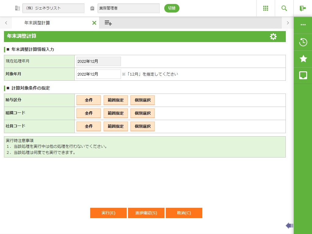 ・年末調整処理時は、1.1.8 給与区分マスタ(業務コードマスタ設定)の年調処理区分が「1:別途で処理」の場合、本機能を実行する必要があります。年調処理区分が「2:給与で処理」または「3:賞与で処理」に設定している場合は、給与計算または賞与計算実行時に年末調整計算が行われるため、本機能を実行する必要はありません。