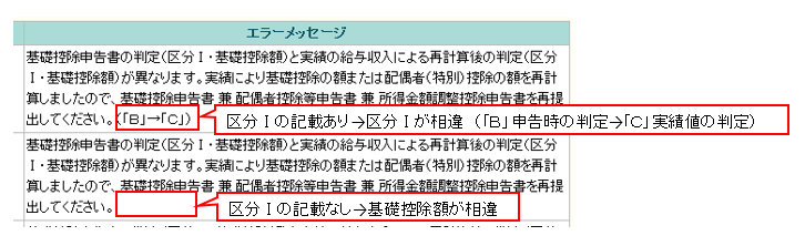 基礎控除申告書の判定(区分T・基礎控除額)と実績の給与収入による再計算後の判定(区分T・基礎控除額)が異なります。実績により基礎控除の額または配偶者(特別)控除の額を再計算しましたので、基礎控除申告書 兼 配偶者控除等申告書 兼 所得金額調整控除申告書を再提出してください。※3 |