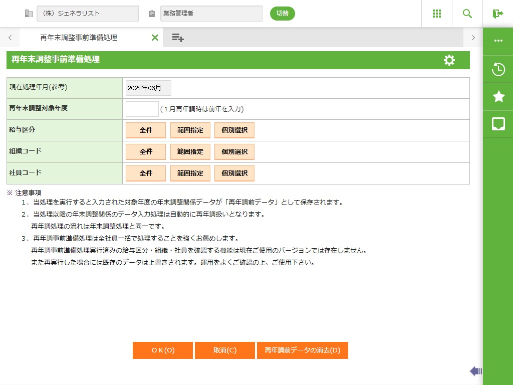 ・ 再年末調整事前準備処理実行済みの給与区分・組織・社員を確認する機能は、存在しません。また、再実行した場合には既存のデータは上書きされます。運用をよくご確認のうえ、ご使用ください。
