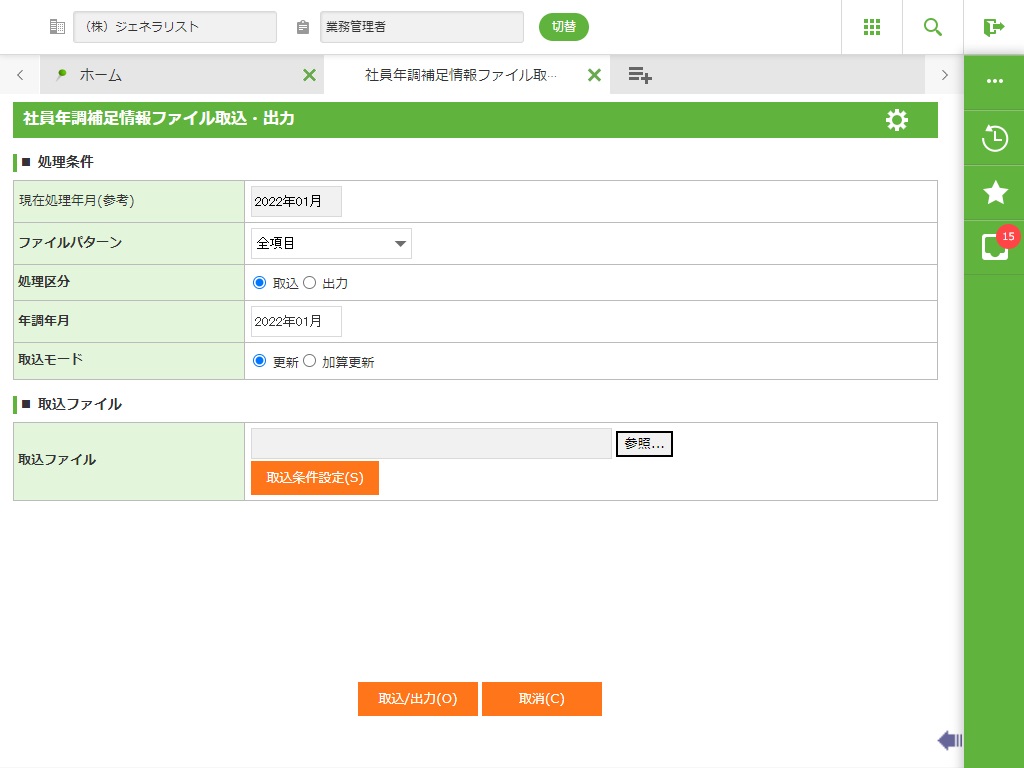 3.6.7.1 社員年調補足情報ファイル取込・出力画面―1
