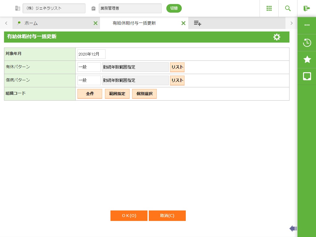 入力した対象年月で有休・傷病の一括付与を行います。 |