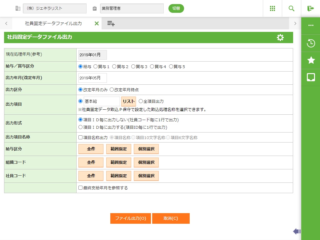 ・ 3.1.27 社員固定データ取込P設定 でファイル形式を固定長として作成したパラメータを使用してファイル出力を行った場合でも、ファイルはCSV形式で出力されます。