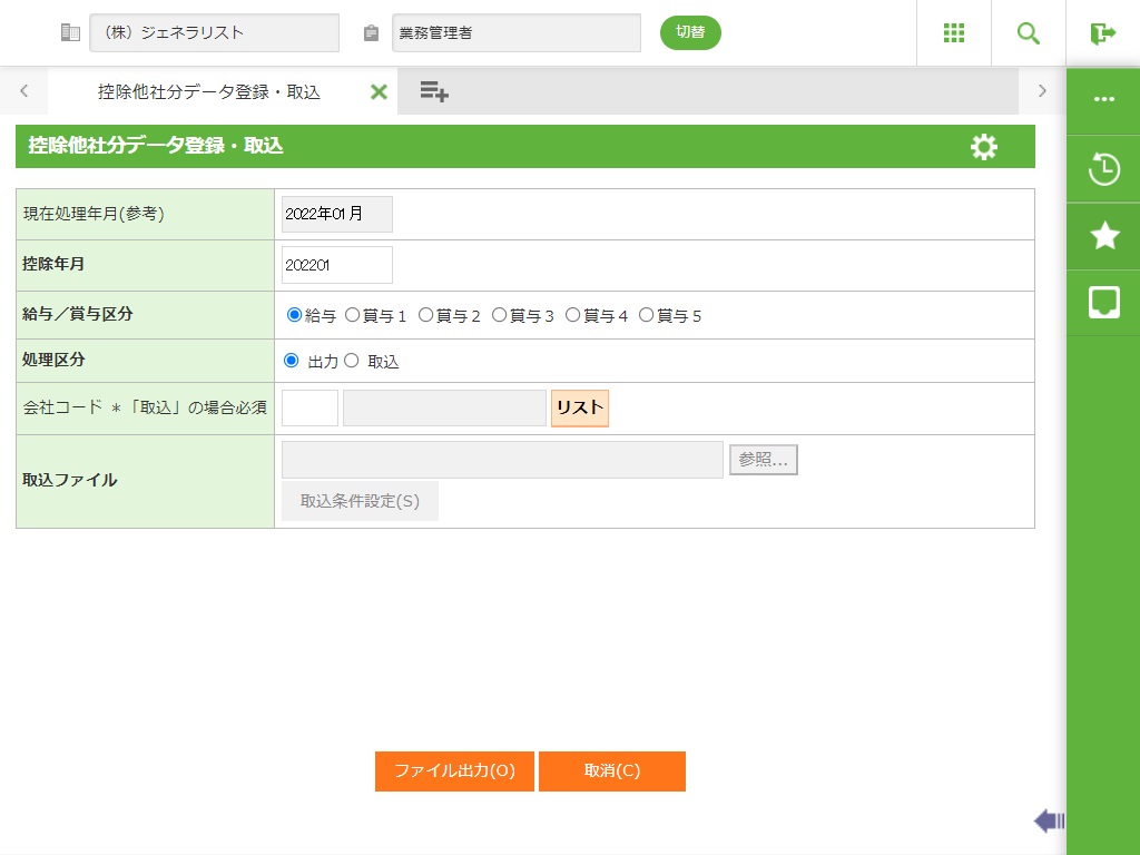 ・ 出力及び取込はログイン法人の法人コードに属する会社のみとします。