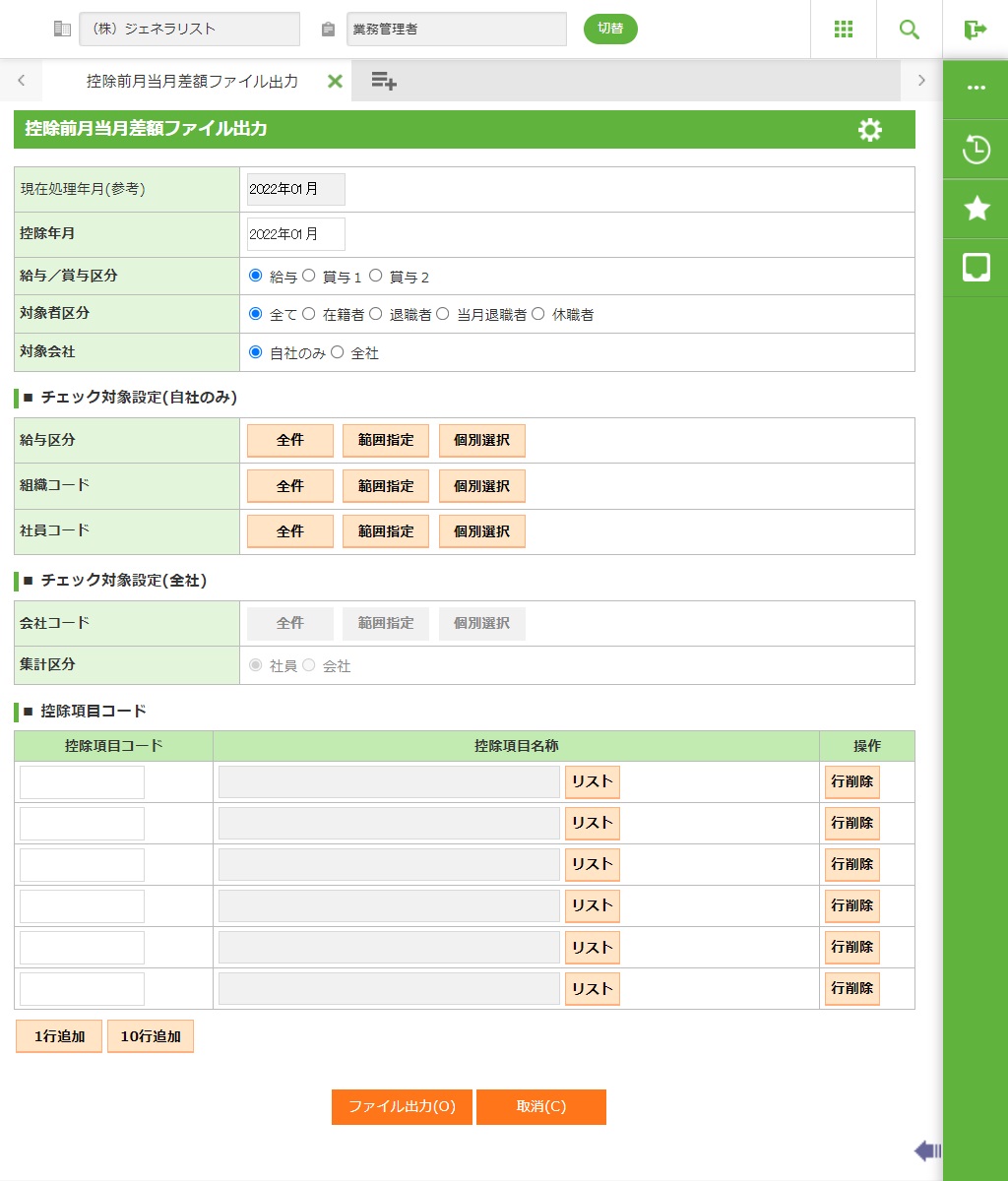 画面で入力された控除項目について前月と当月の金額を比較し、差額の有るデータをCSVファイルへ出力します。