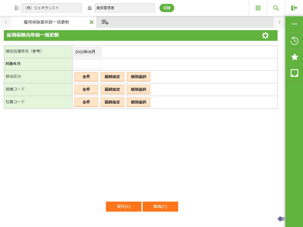 ・ 抽出した社員の賃金と加入年数を確認後、高年齢雇用継続給付対象を指定し、指定した社員について3.1.62 社員雇用保険情報登録の「■高年齢 申請対象」を一括更新します。