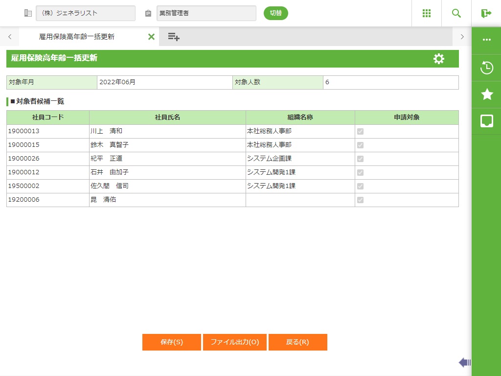 ・ 対象者候補一覧のソート順は、3.1.62 社員雇用保険情報登録の「■高年齢 認定区分」の降順、組織コードの昇順、社員コードの昇順です。