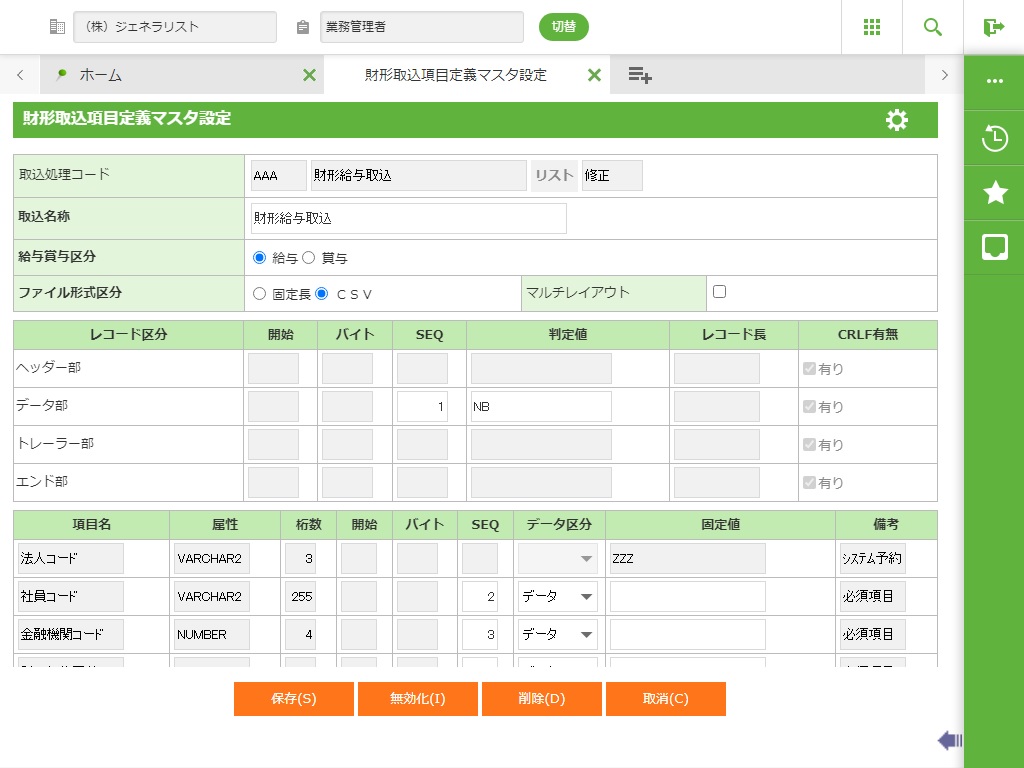 取込データの区分を指定します。ヘッダー、データ、トレーラ、エンドから選択します。 |