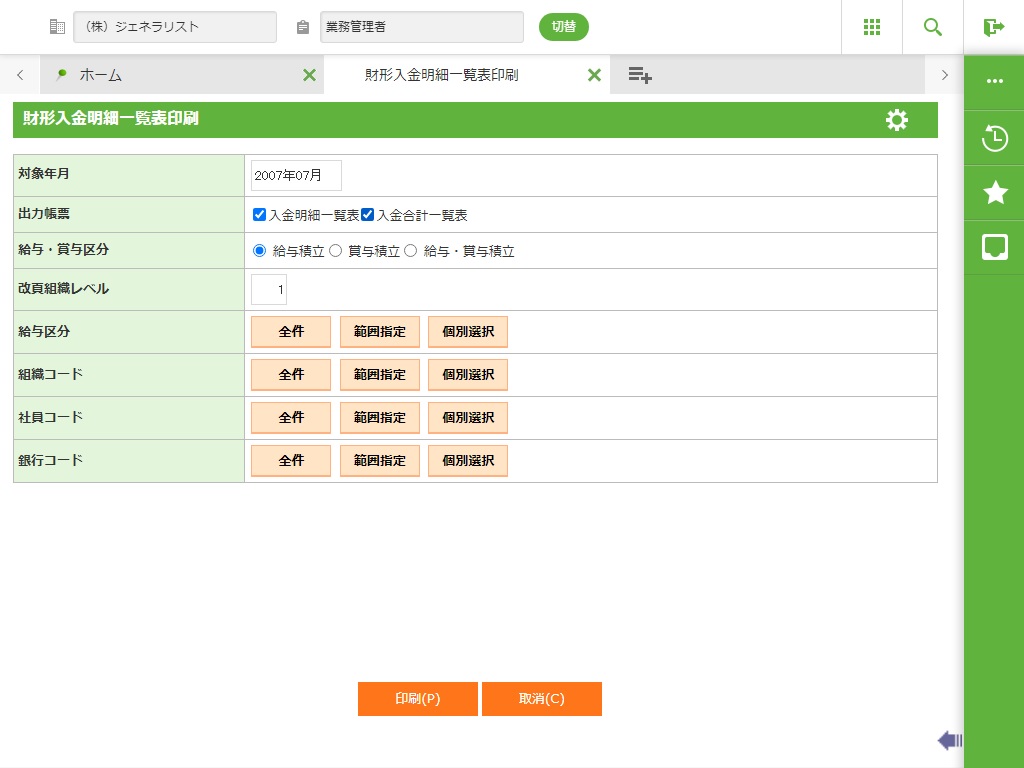 積立額・残高を確認するために、財形入金明細一覧表、財形入金合計一覧表を出力します。