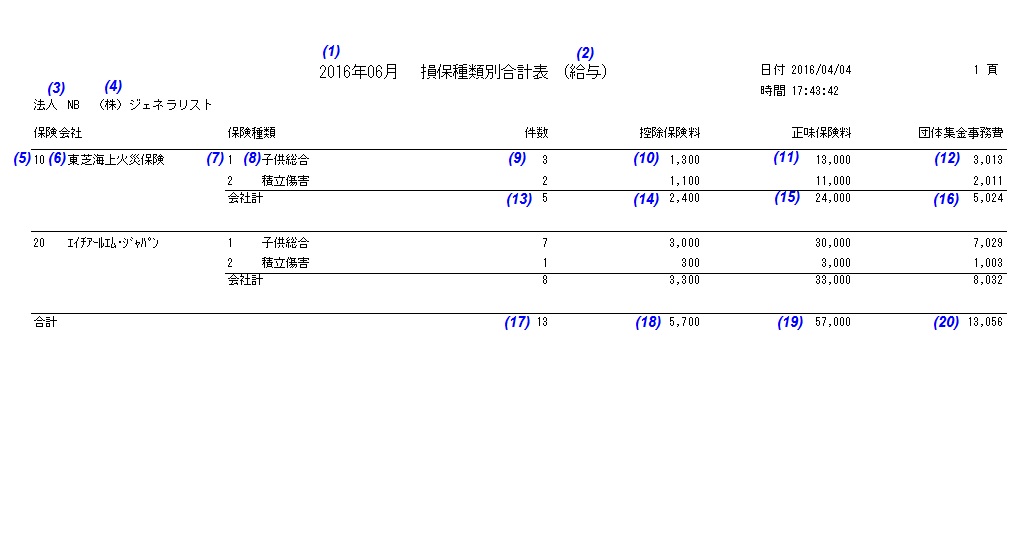・ 帳票「損保データ種類別合計表(総合計)」について、法人ごとに集計を行います。「各種データ台帳一括取込」実行時に取込先となる法人(社員基本情報から取得)を、集計先の法人とします。