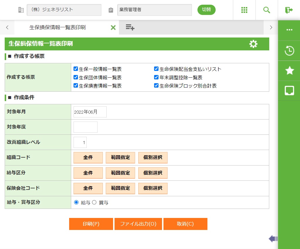 作成する帳票にチェックします。 生保一般情報一覧表 |