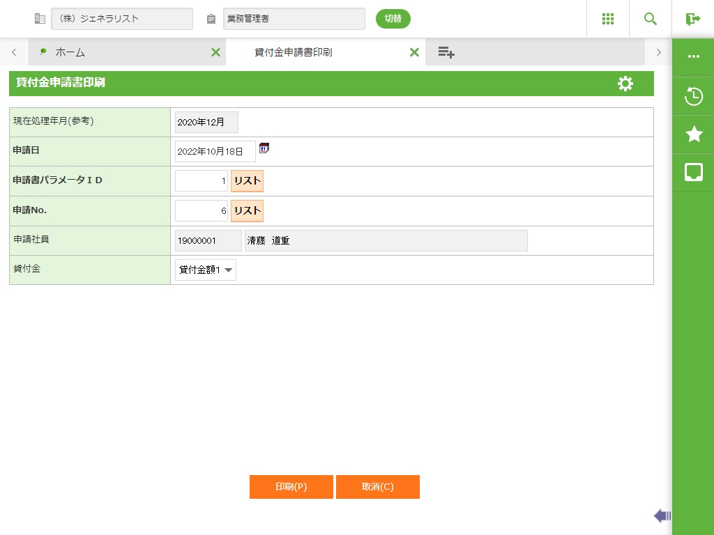 貸付金申請書の印刷条件を設定して帳票を出力します。