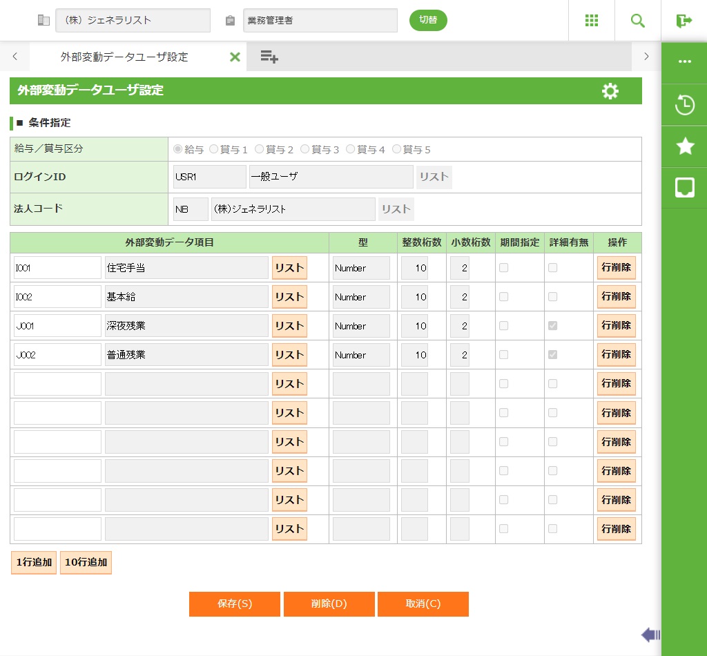 ログインIDで登録したユーザが、利用できる項目コードを入力します。 <リスト>外部変動データ項目コード表示画面を呼び出します。 | 10 |