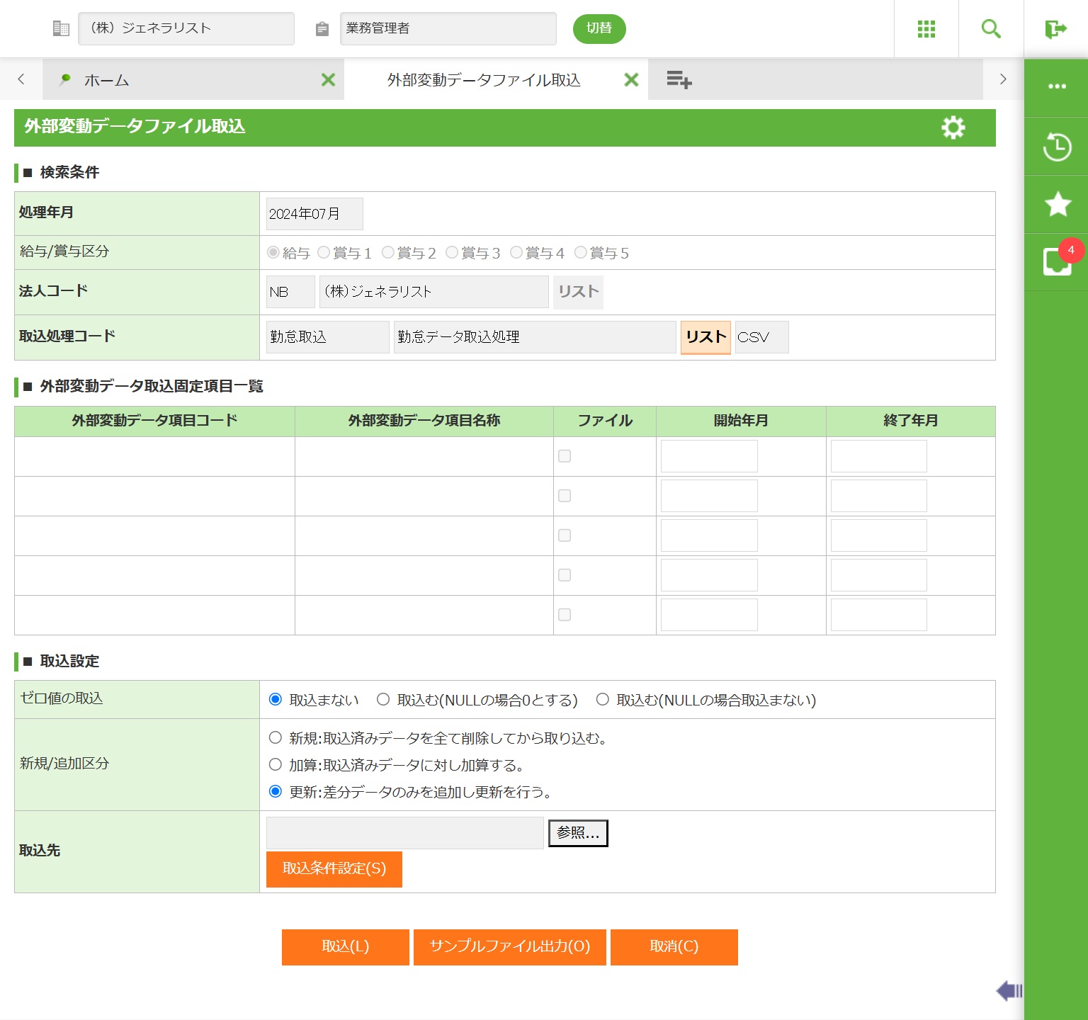 「外部変動データ取込P設定」にて「法人コード」の指定、取込みファイルに