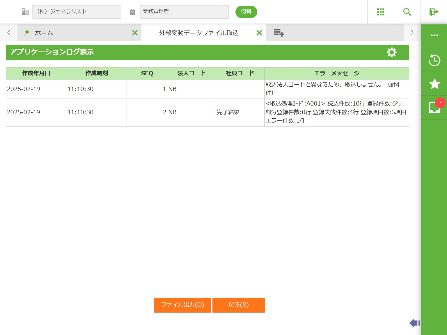 ・ 外部変動データファイル取込後にログをアプリケーションログ表示画面に表示します。エラーと完了結果を確認してください。