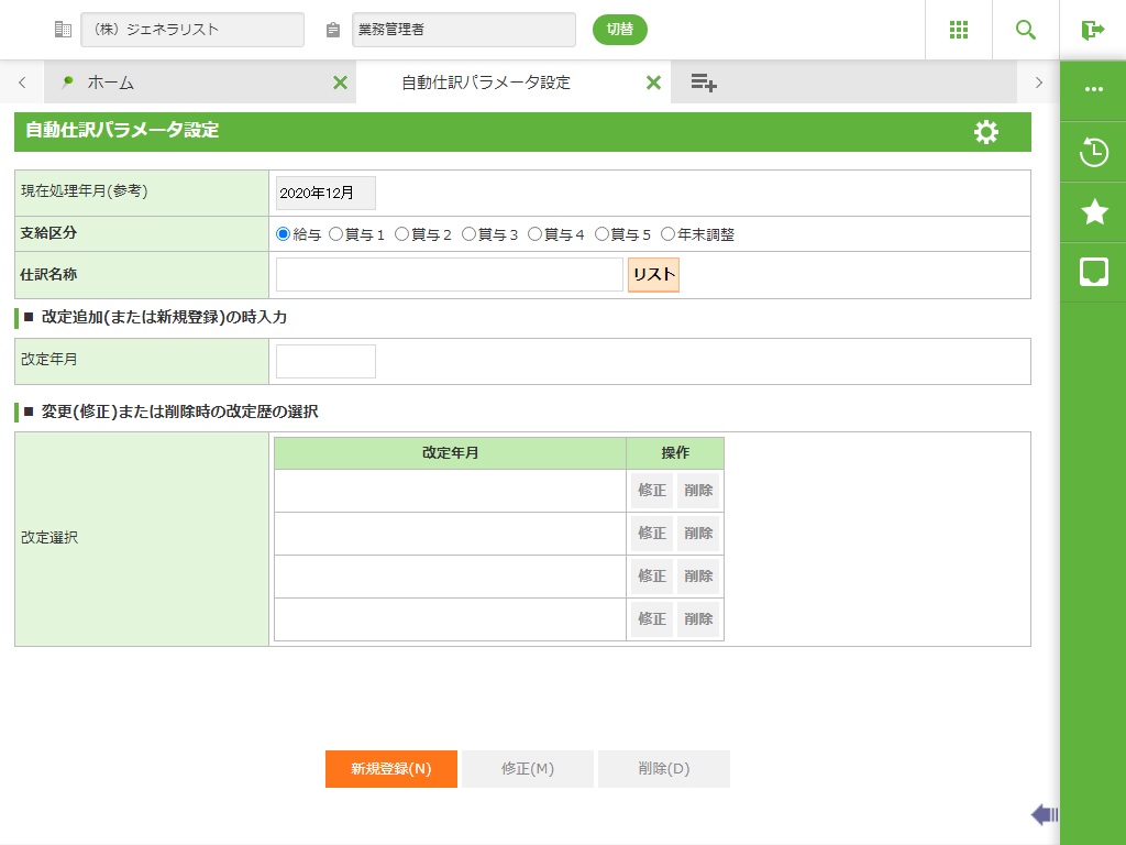 自動仕訳を行う仕訳パターンについてのパラメータを、法人、支給区分単位に登録します。1パラメータに登録できる項目は、借方・貸方の1行分です。仕訳パターン毎に対応する給与の支給項目(給与、賞与1〜5、年末調整)を設定します。