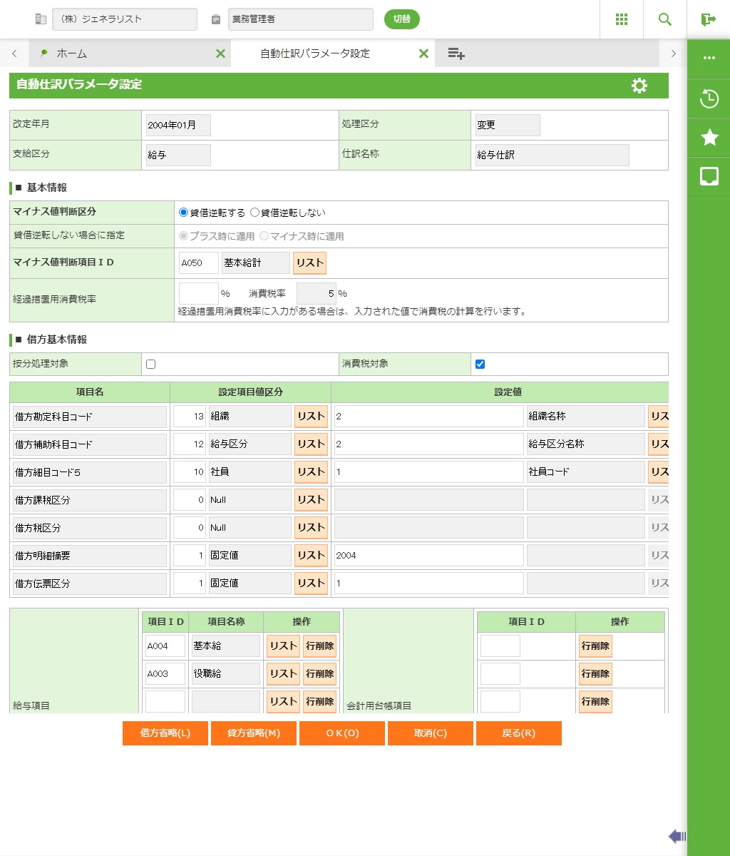 ・ 借方の設定(設定項目値区分、設定値、項目ID)を省略する場合に「借方省略」ボタンを実行します。