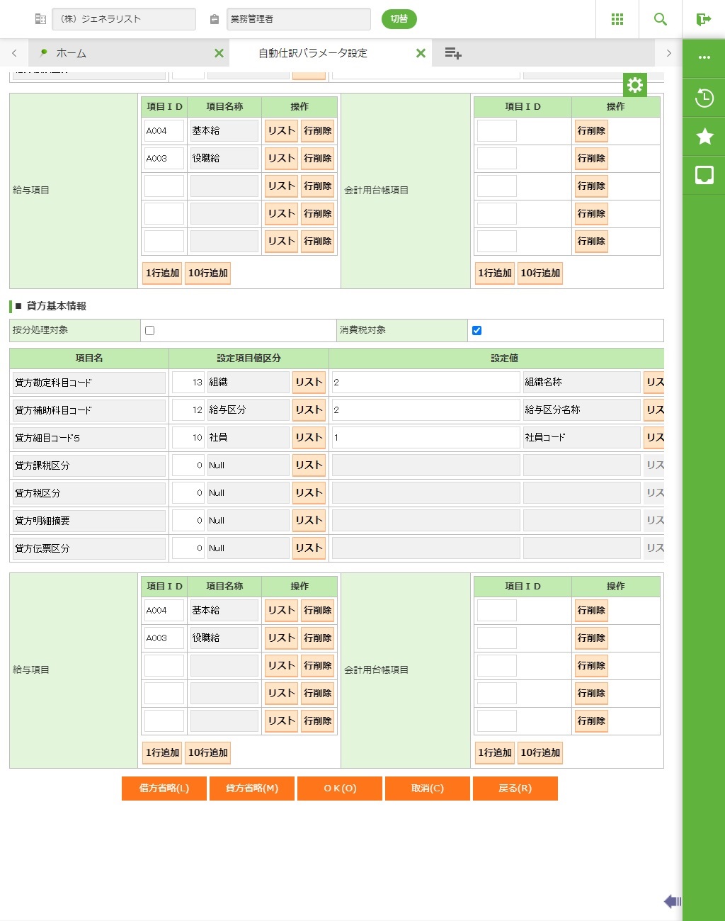 ・ 貸方の設定(設定項目値区分、設定値、項目ID)を省略する場合に「貸方省略」ボタンを実行します。