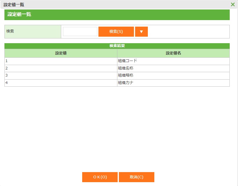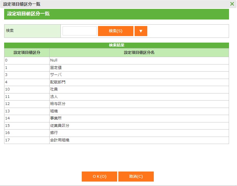 ・ 設定項目値区分を検索し、一覧が表示されます。検索・表示させることもできます。