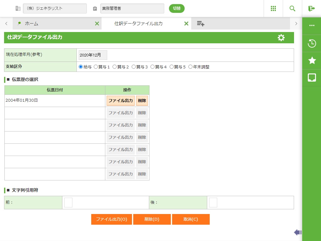 法人、支給区分、伝票日付ごとに会計連動仕訳データの外部ファイル(CSV)出力を行います。