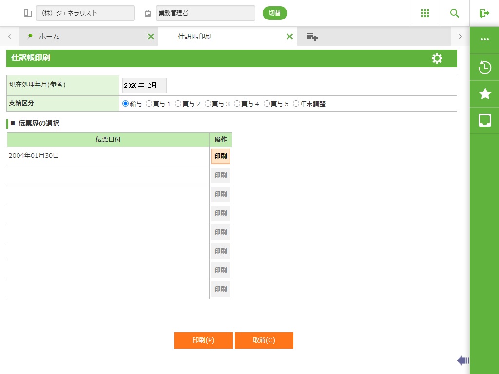 ・ 法人、支給区分、伝票日付ごとの会計連動仕訳帳の印刷を行います。