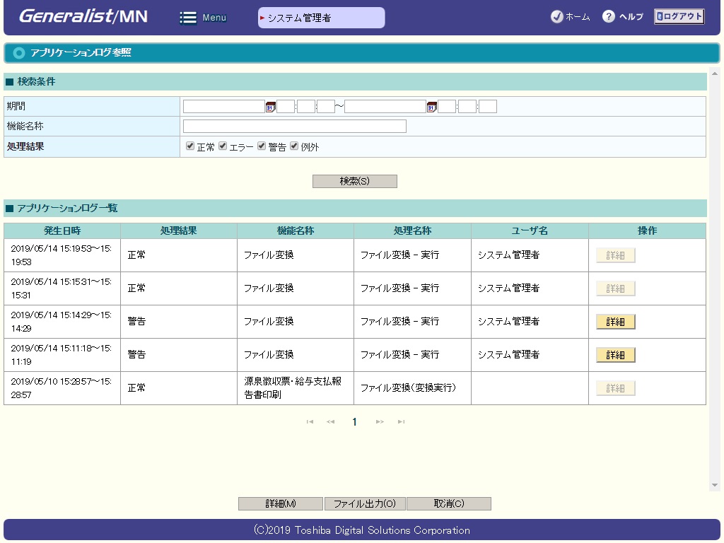 入力した検索条件に合致するアプリケーションログの一覧を表示します。 |