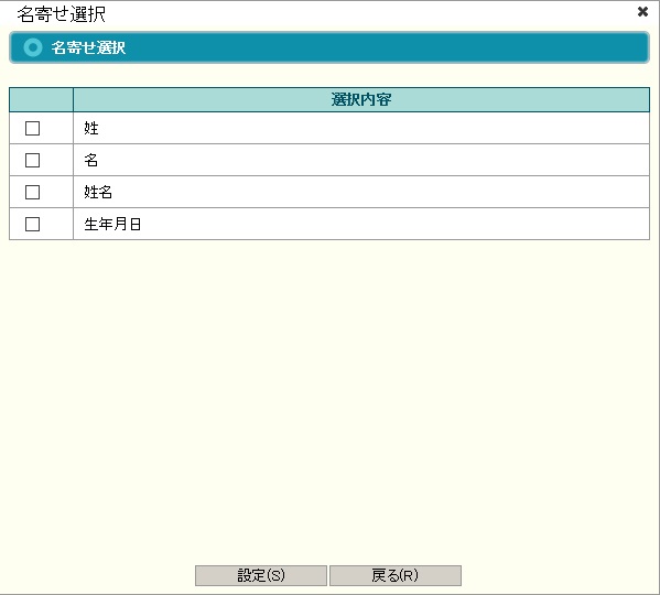 ・ 登録済みの持ち主に対しデータの更新を行う場合、登録されている姓名・生年月日・汎用情報等の項目を使用して更新対象者をチェックすることができます。チェックを行う場合は、名寄せ項目設定画面でチェックに使用する項目を選択します。名寄せ項目設定画面でチェックに使用する項目は複数項目を同時に選択することができます。
