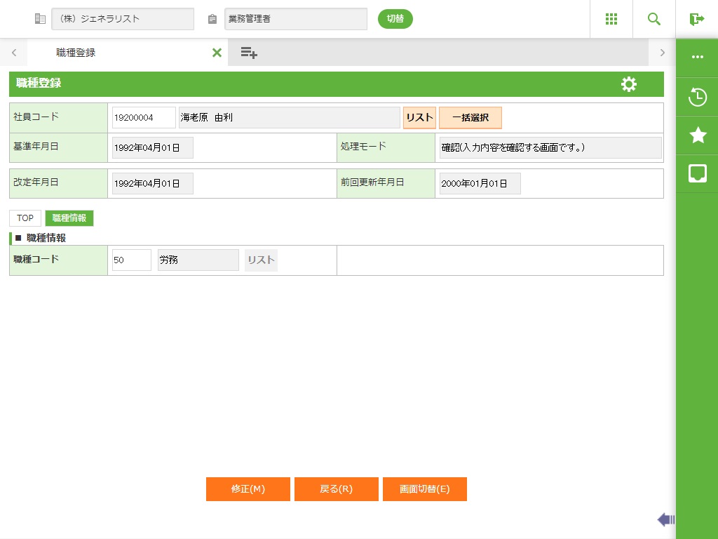 社員選択で入力した社員の職種情報を修正します。修正画面が表示されます。 |