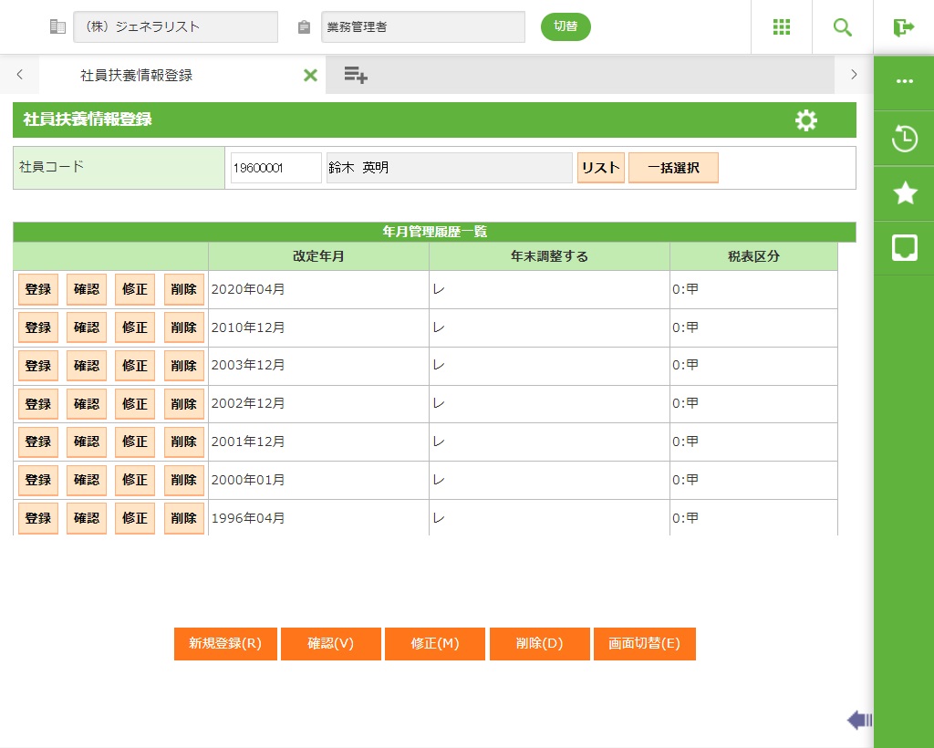 社員選択で入力した社員の社員扶養情報を確認します。確認画面が表示されます。 |