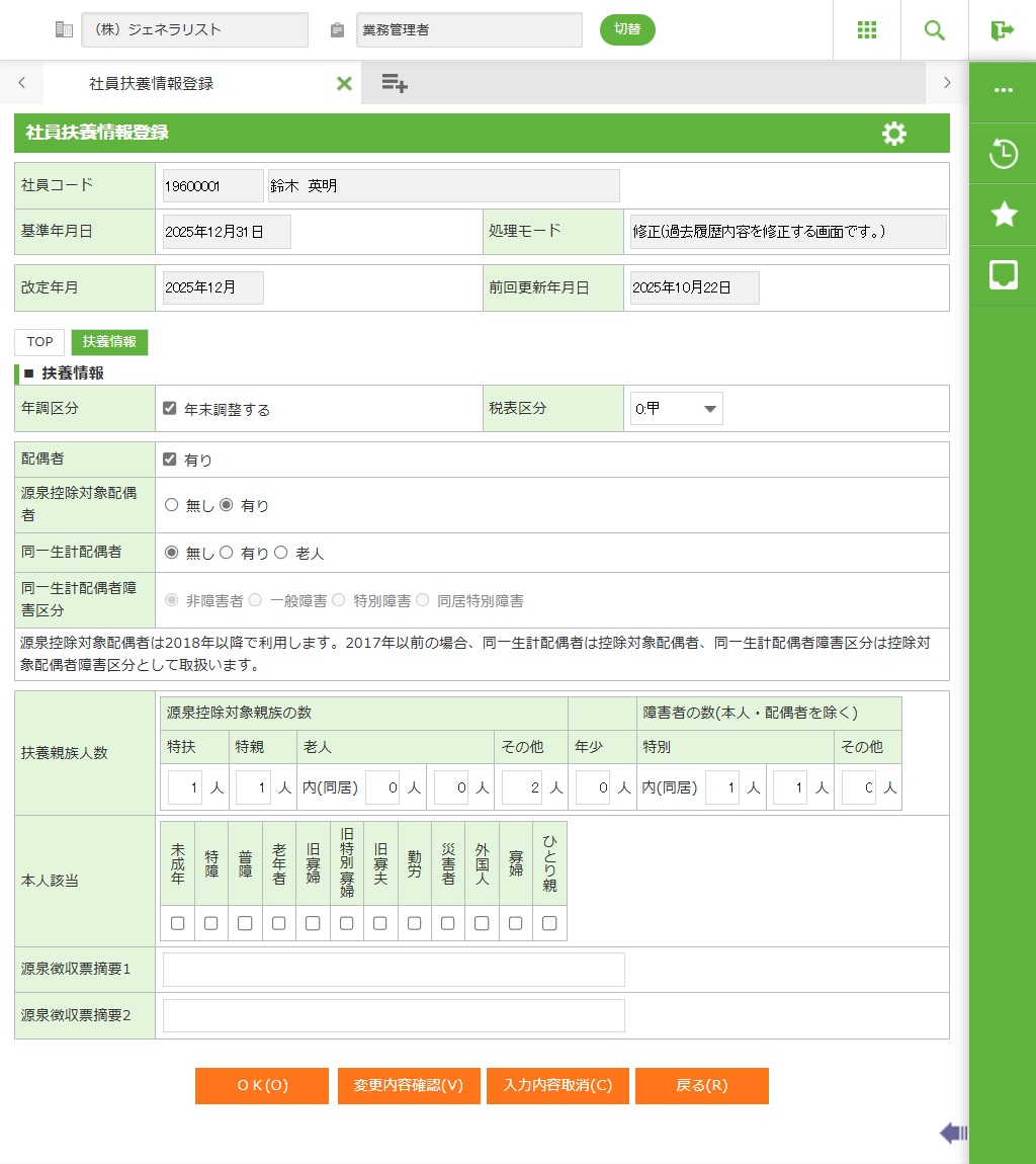 配偶者、扶養情報(扶養人数、障害人数等)、本人障害情報(特障、老年者等)などに変更が発生した場合に改定の登録を行います。
