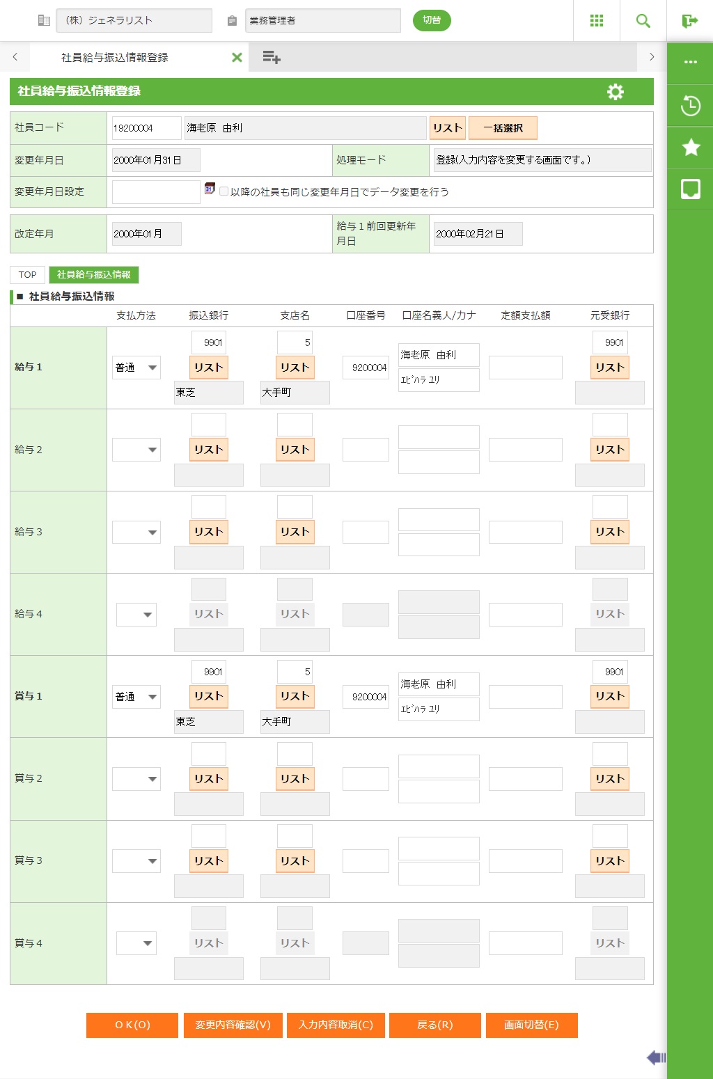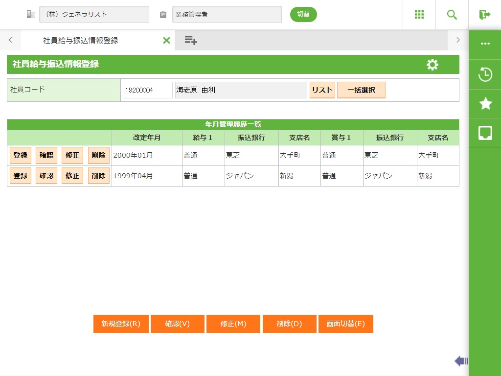 社員選択で入力した社員の社員給与振込情報を確認します。確認画面が表示されます。 |