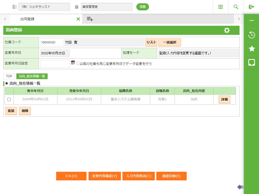 ・ 導入時に出向・休職状態にある社員の出向内容を登録します