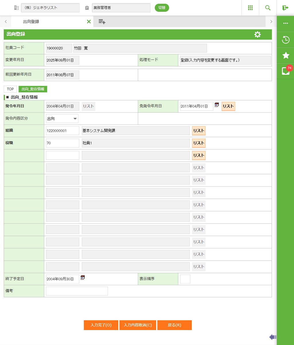 社員の出向内容を登録します。