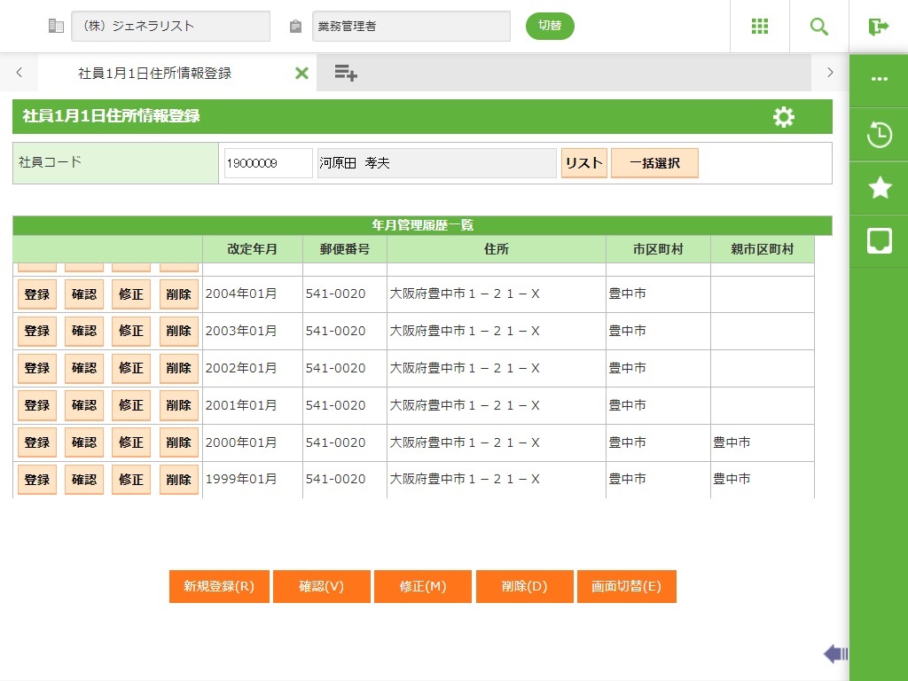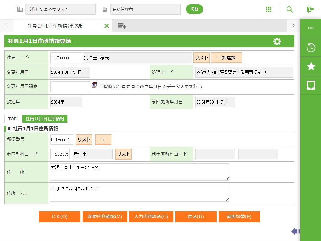 社員選択で入力した社員の社員1月1日住所情報を新規登録します。詳細画面が表示されます。 |