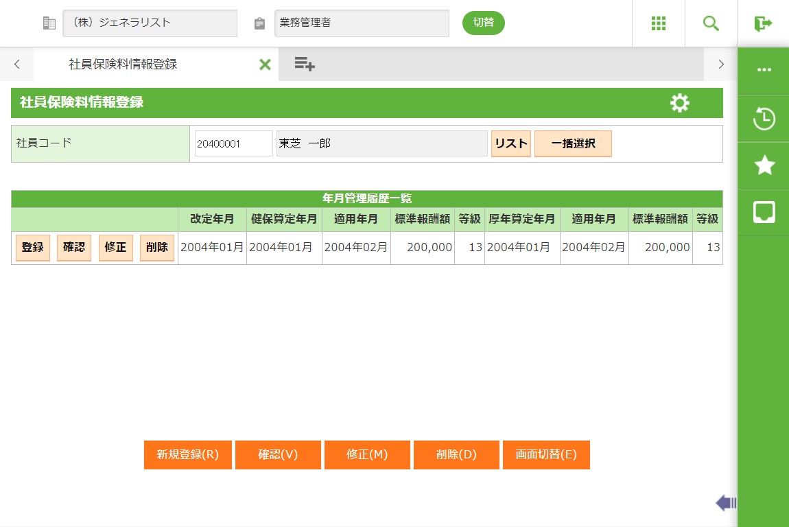 社員選択で入力した社員の社員保険料情報(テーブル)を確認します。確認画面を表示します。 |